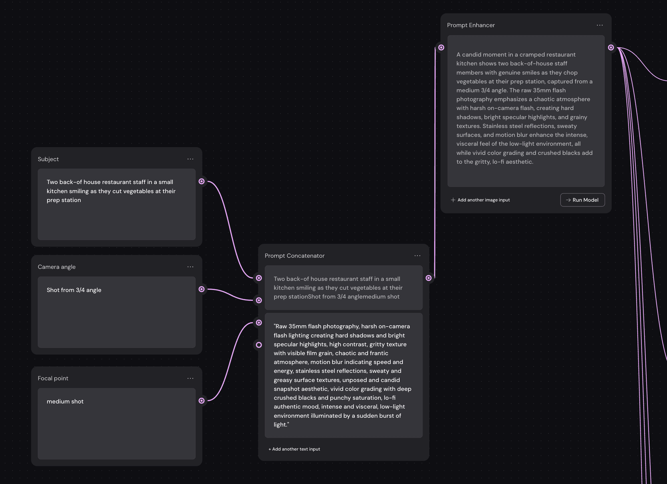 I started by creating a simple workflow in Weavy to help generate images that would fit our brand style. The idea is that anyone on our brand team could enter a small amount of creative direction into the furthest left boxes, and then Weavy's Prompt Concatenator and Prompt Enhancer would pull all of the direction into a single prompt that was optimized for AI image generation.